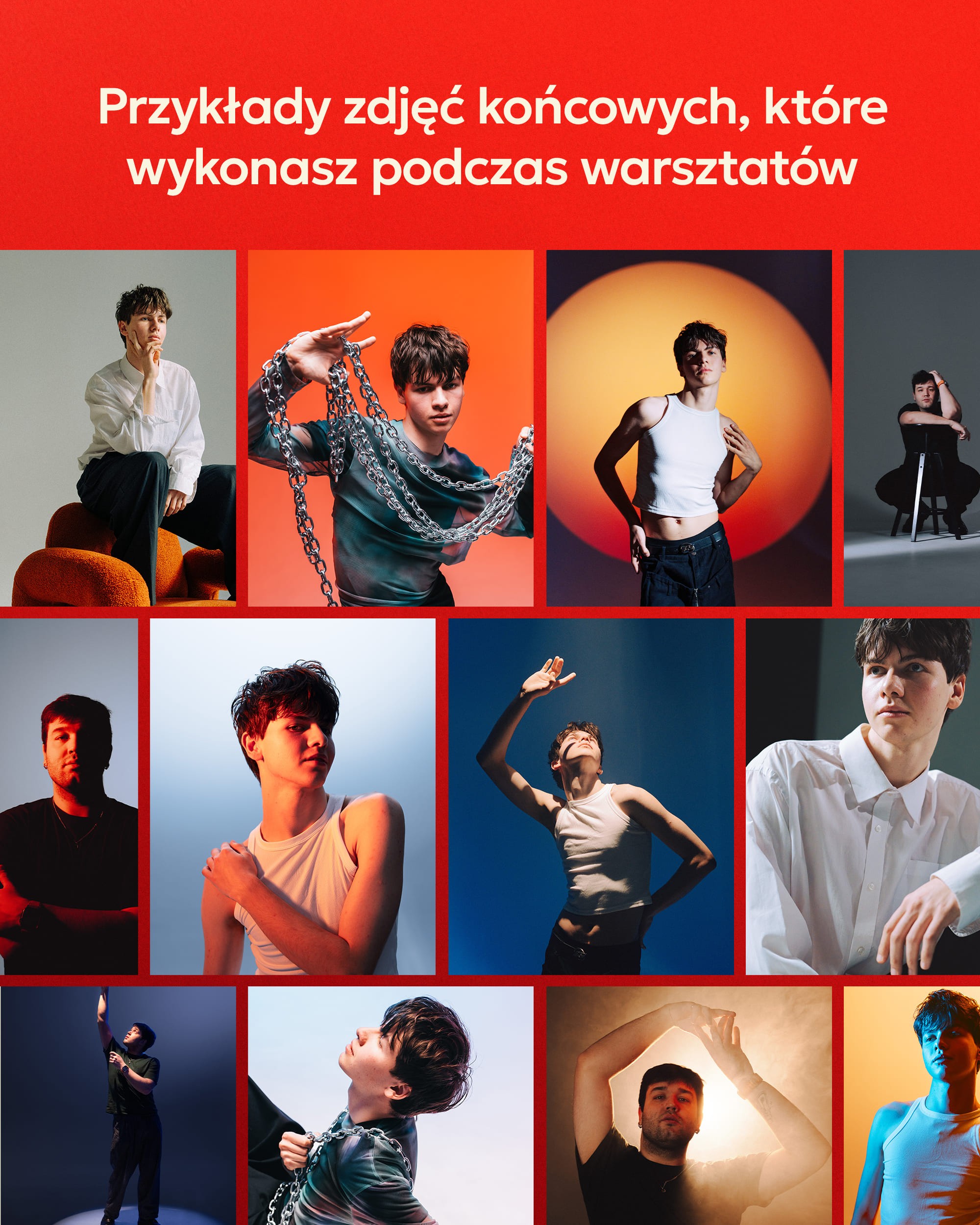 Na warsztacie czeka na Ciebie maksimum praktyki: praca ze sprzętem, schematami oświetlenia oraz profesjonalny model w 3 stylizacjach.